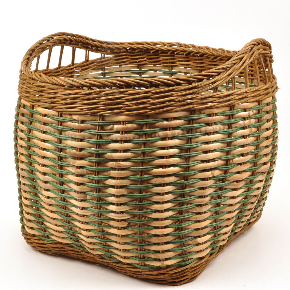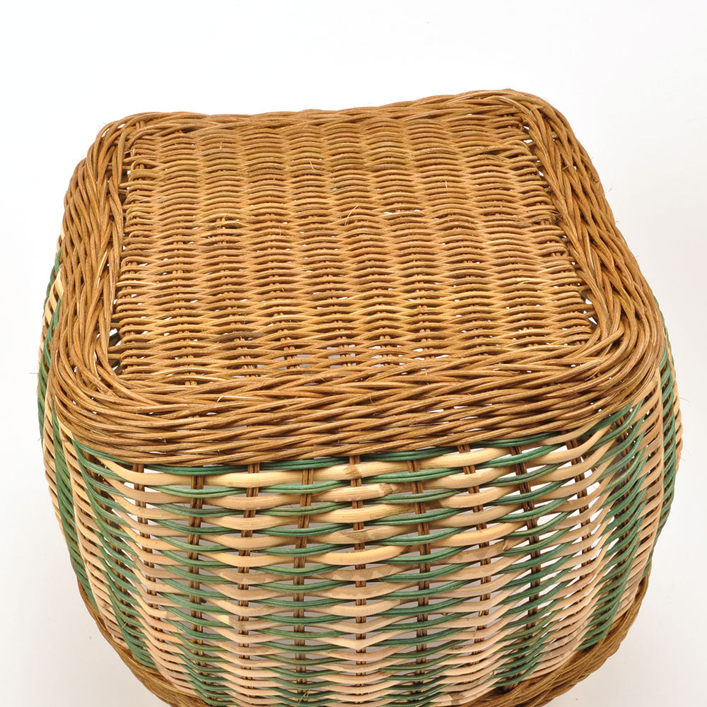 Firkantet opbevaringskurv af vikkelsjener og peddigrør.